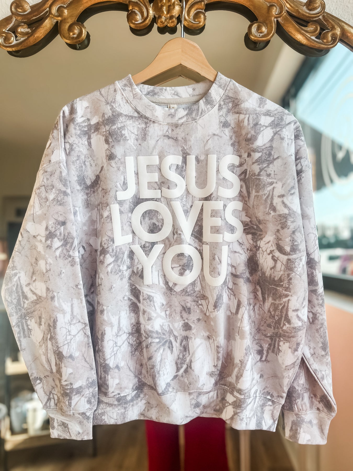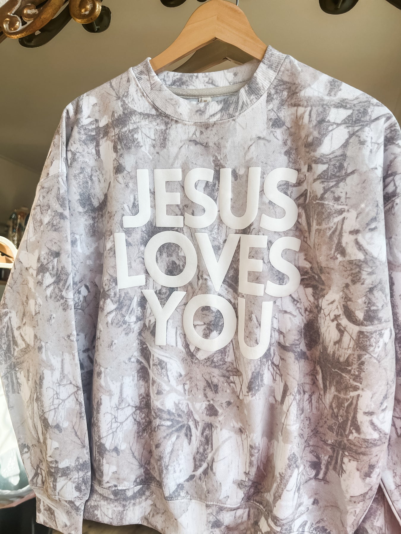 Share a message of love and faith in the Cream Camo Crewneck. This soft pink sweatshirt features a subtle camo pattern layered with bold “JESUS LOVES YOU” lettering across the front. Cozy, lightweight, and easy to style, it’s designed for everyday encouragement and effortless comfort.