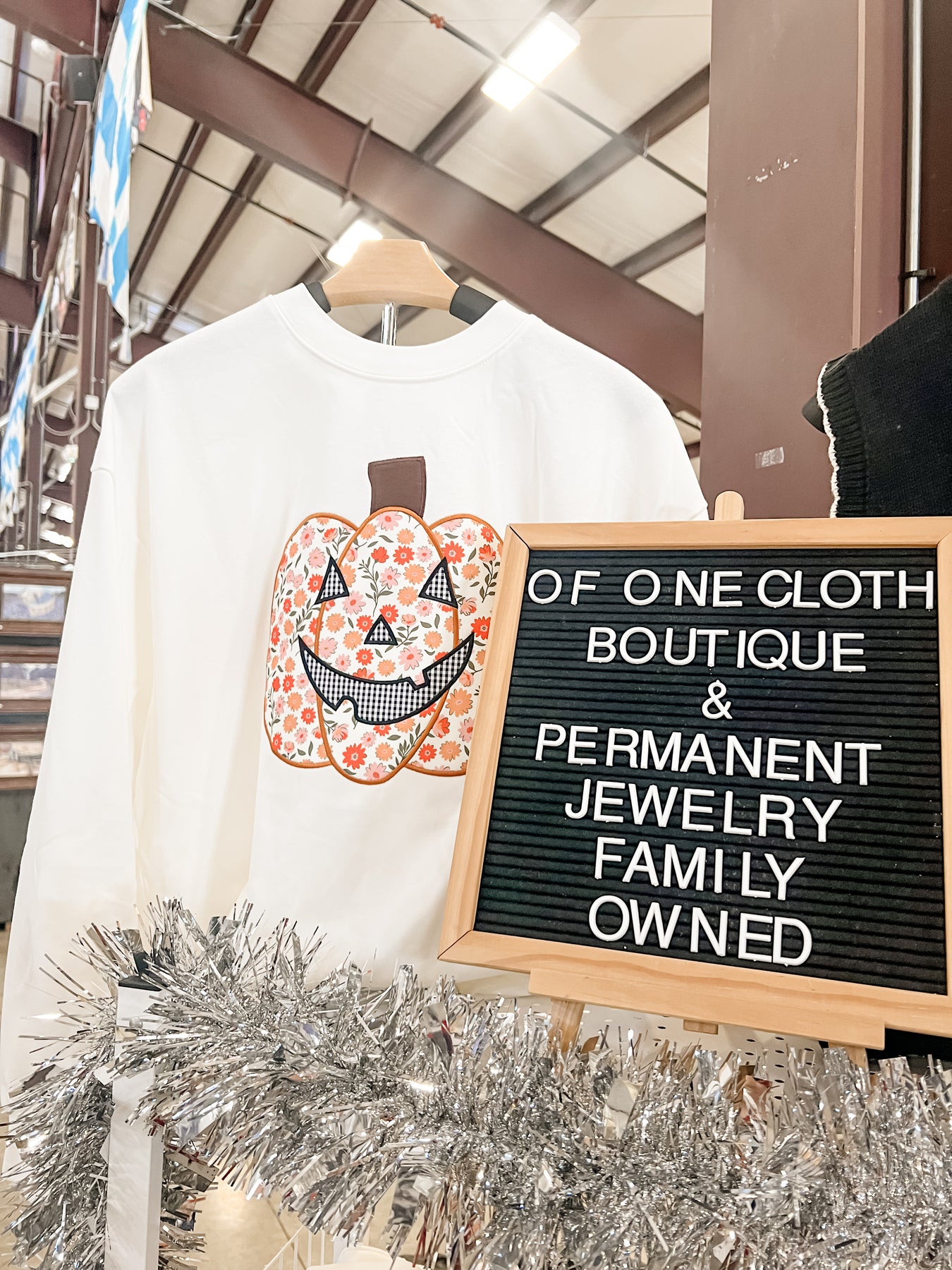 Celebrate the season with soft comfort and a pop of fall charm. This long sleeve crewneck top features a floral-printed pumpkin patchwork design that adds a feminine touch to your favorite autumn look. Made with a cozy cotton-poly blend, itโs perfect for crisp days, coffee runs, and cozy gatherings.