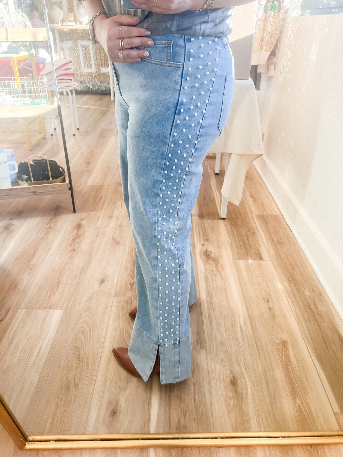 A statement denim moment. These wide leg jeans feature a relaxed silhouette with pearl embellishments cascading down each side and a split cuff hem for effortless movement. Elevated, feminine, and designed to shine from brunch to evenings out.
