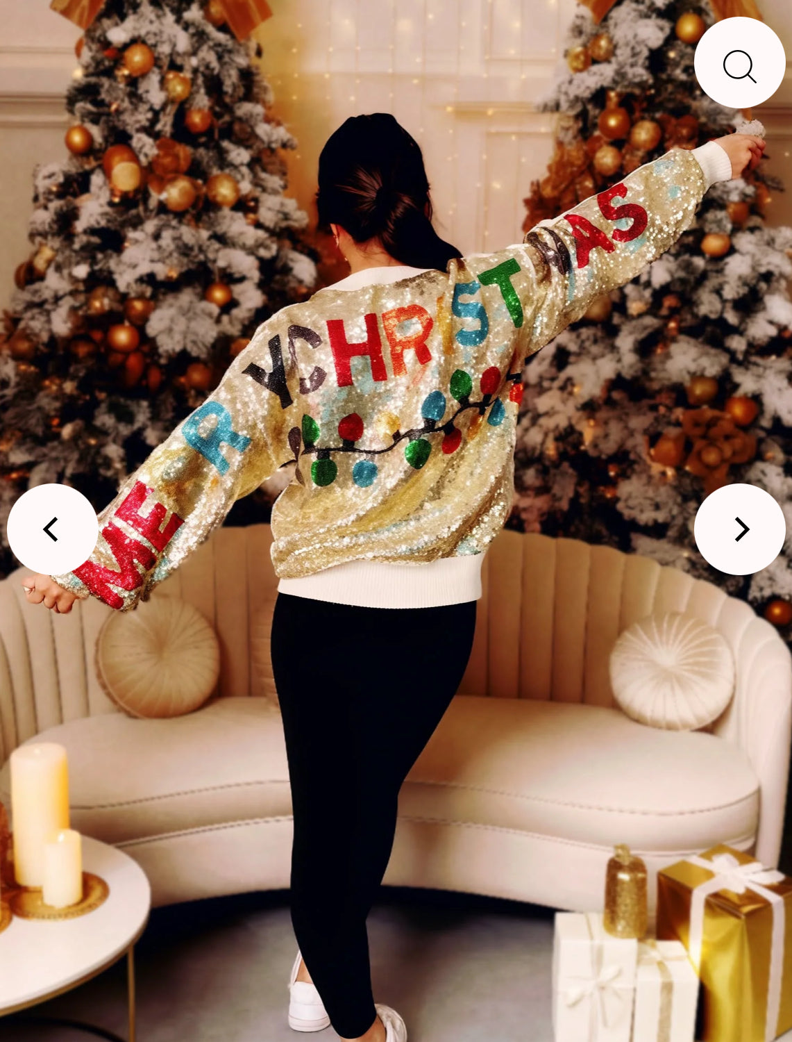 Turn heads this holiday season with the Merry Christmas Sequin Sweater! Featuring a dazzling full gold sequin front and a statement-making back with “MERRY CHRISTMAS” in bold lettering and colorful embroidered string lights, this sweater is all things merry and bright.