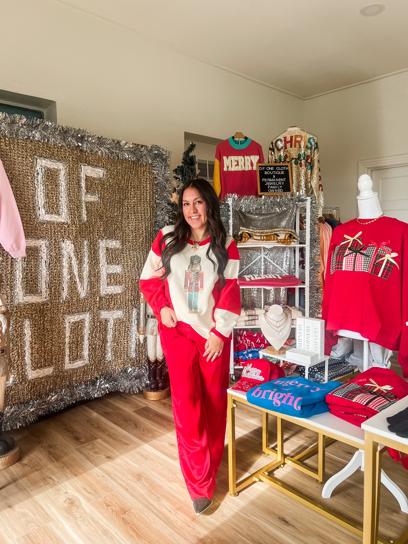 Add a touch of festive flair to your wardrobe with this cozy-chic sweatshirt featuring a charming Nutcracker embellishment. Made with soft French terry fabric, this piece combines comfort and seasonal style in the best way.
