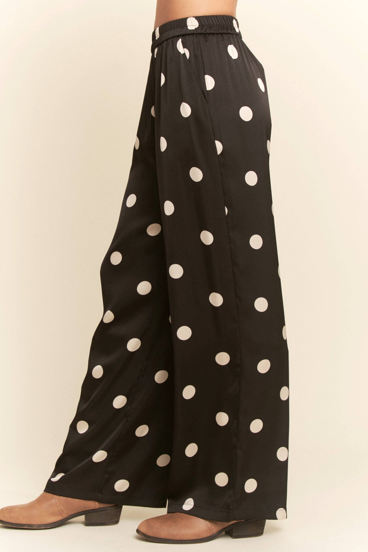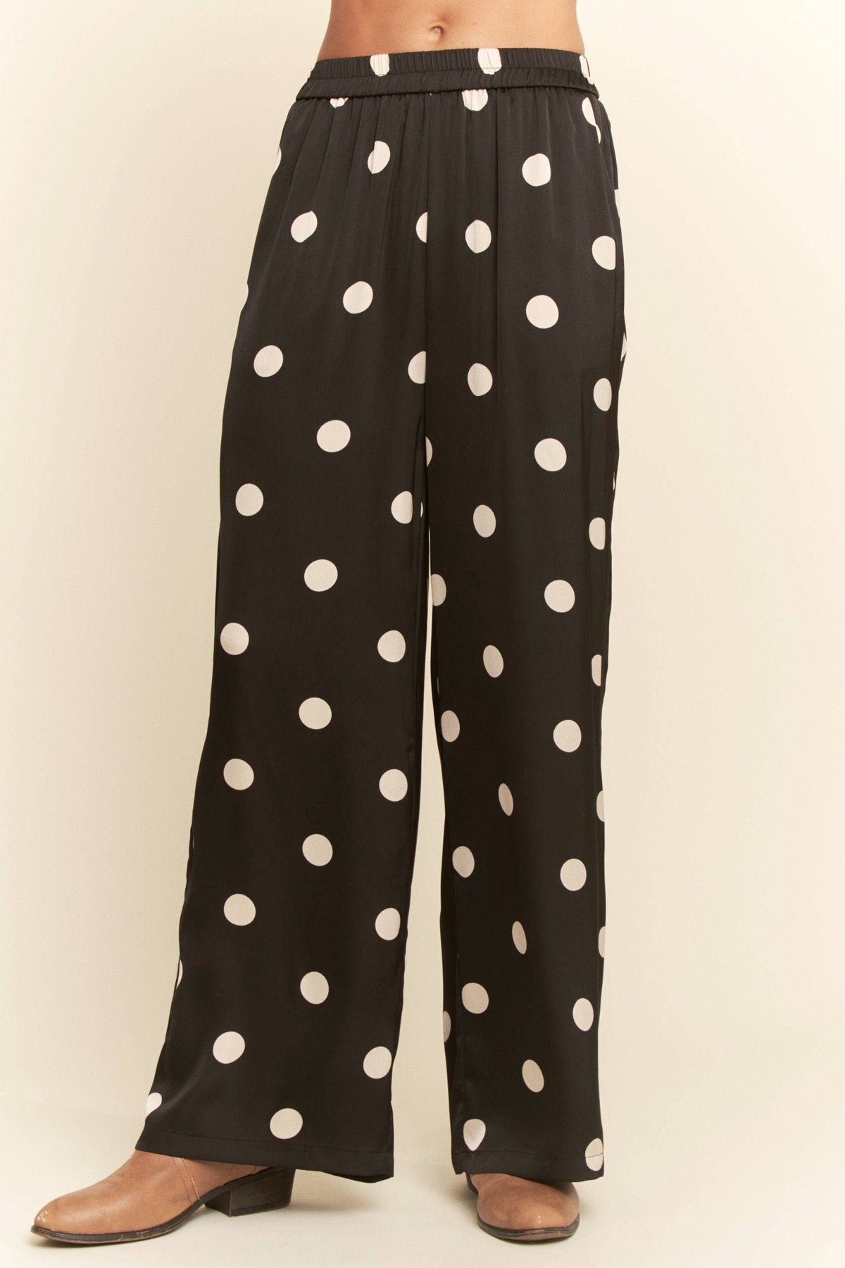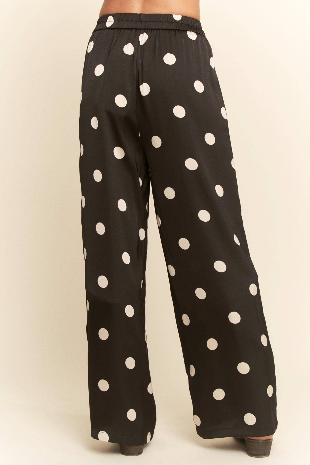 Slip into effortless style with these black satin pants sprinkled with crisp white polka dots. • Soft, silky feel with a beautiful drape • Relaxed, comfortable fit • Easy elastic waistband • Perfect for holiday parties, girls night, or a dressed-up casual look Pair with your favorite sweater or a sleek bodysuit for a chic, timeless outfit you’ll love all season long.