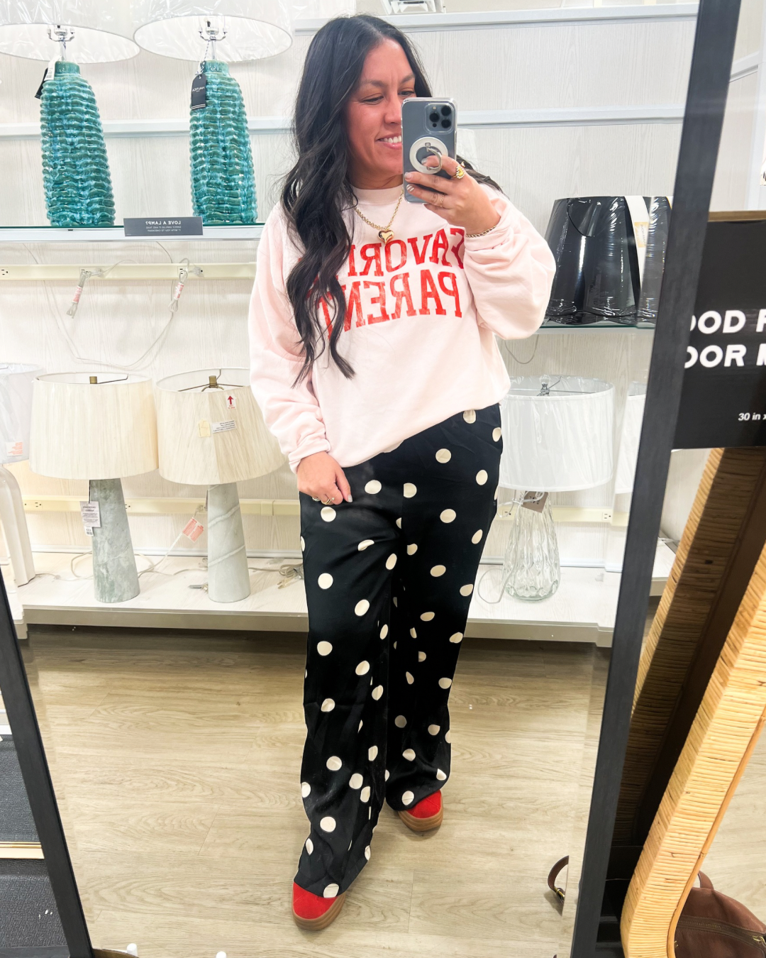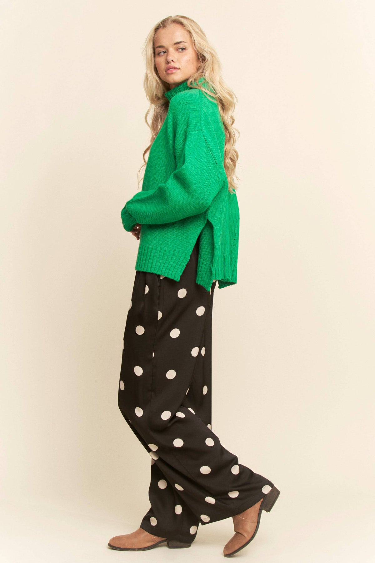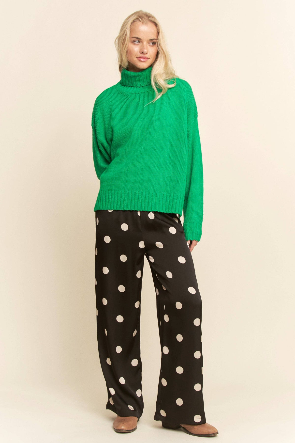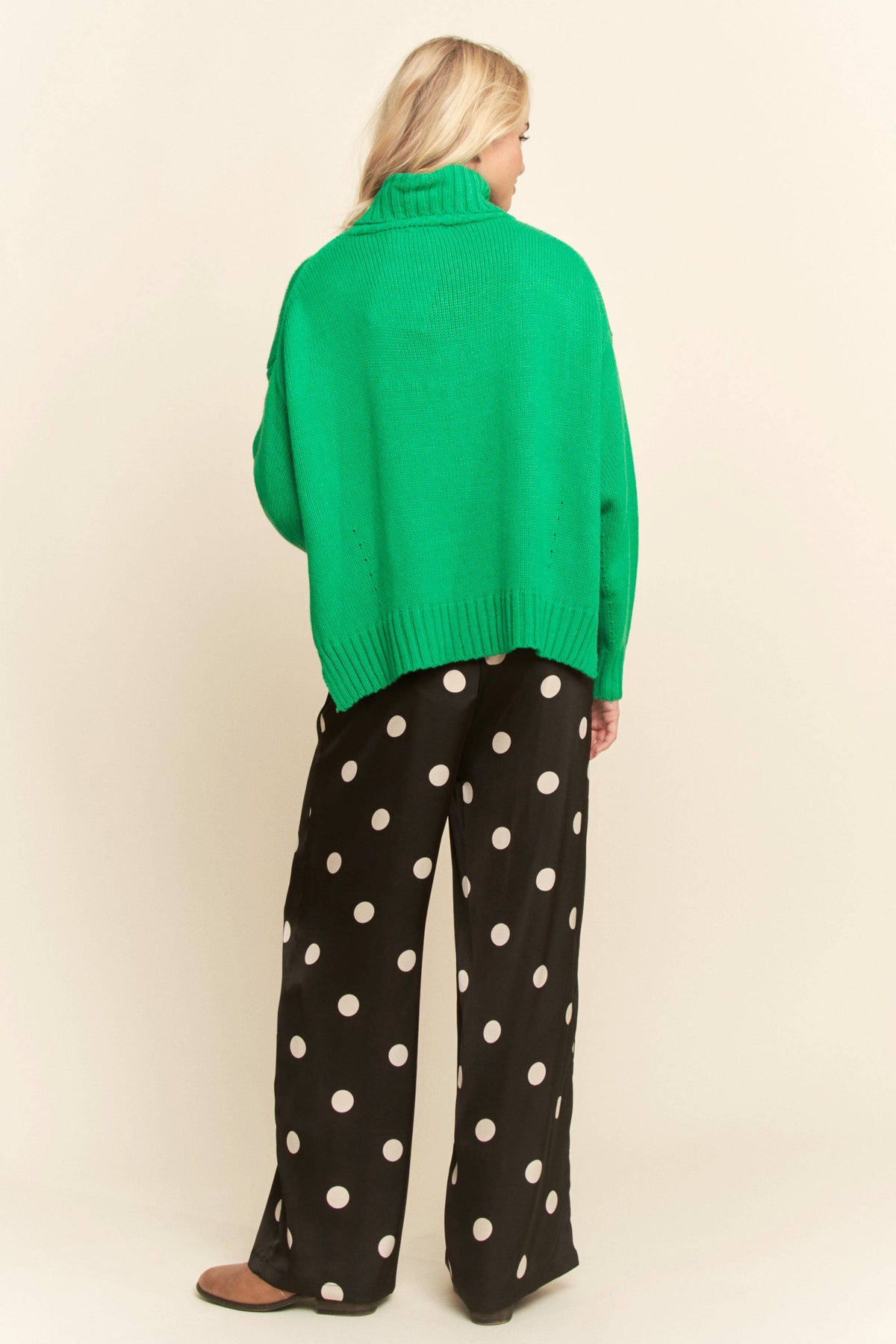 Slip into effortless style with these black satin pants sprinkled with crisp white polka dots. • Soft, silky feel with a beautiful drape • Relaxed, comfortable fit • Easy elastic waistband • Perfect for holiday parties, girls night, or a dressed-up casual look Pair with your favorite sweater or a sleek bodysuit for a chic, timeless outfit you’ll love all season long.